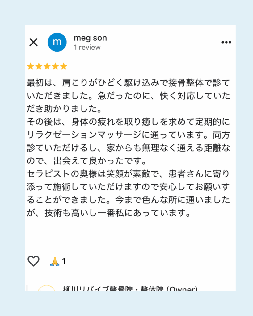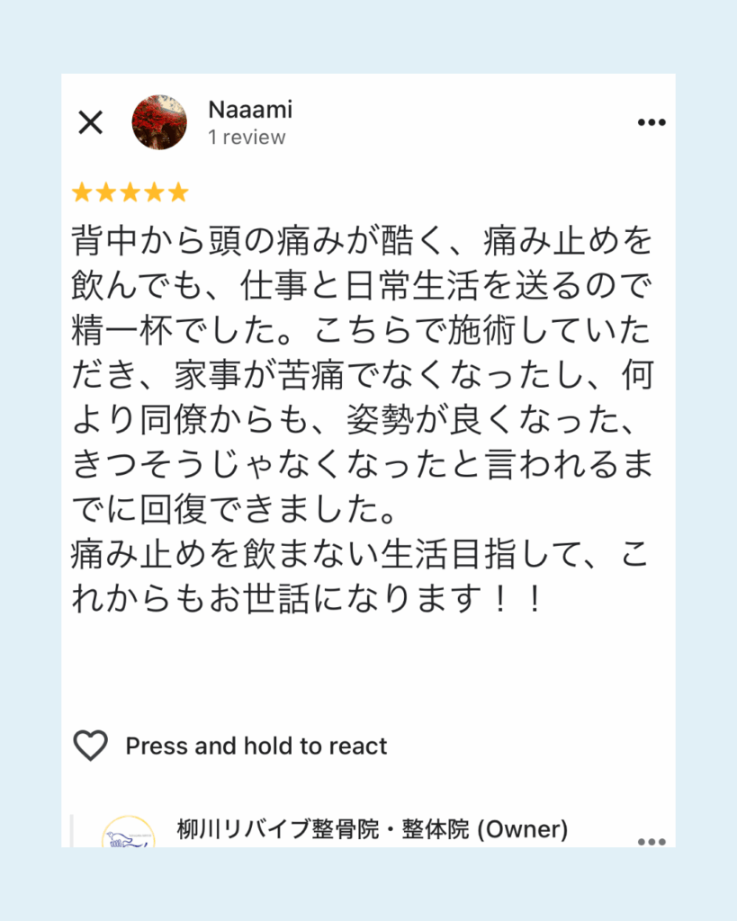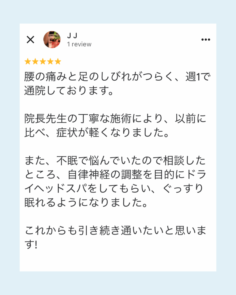 整骨院の《全身調整》を受けた方から、うれしいお声をいただきました☺️