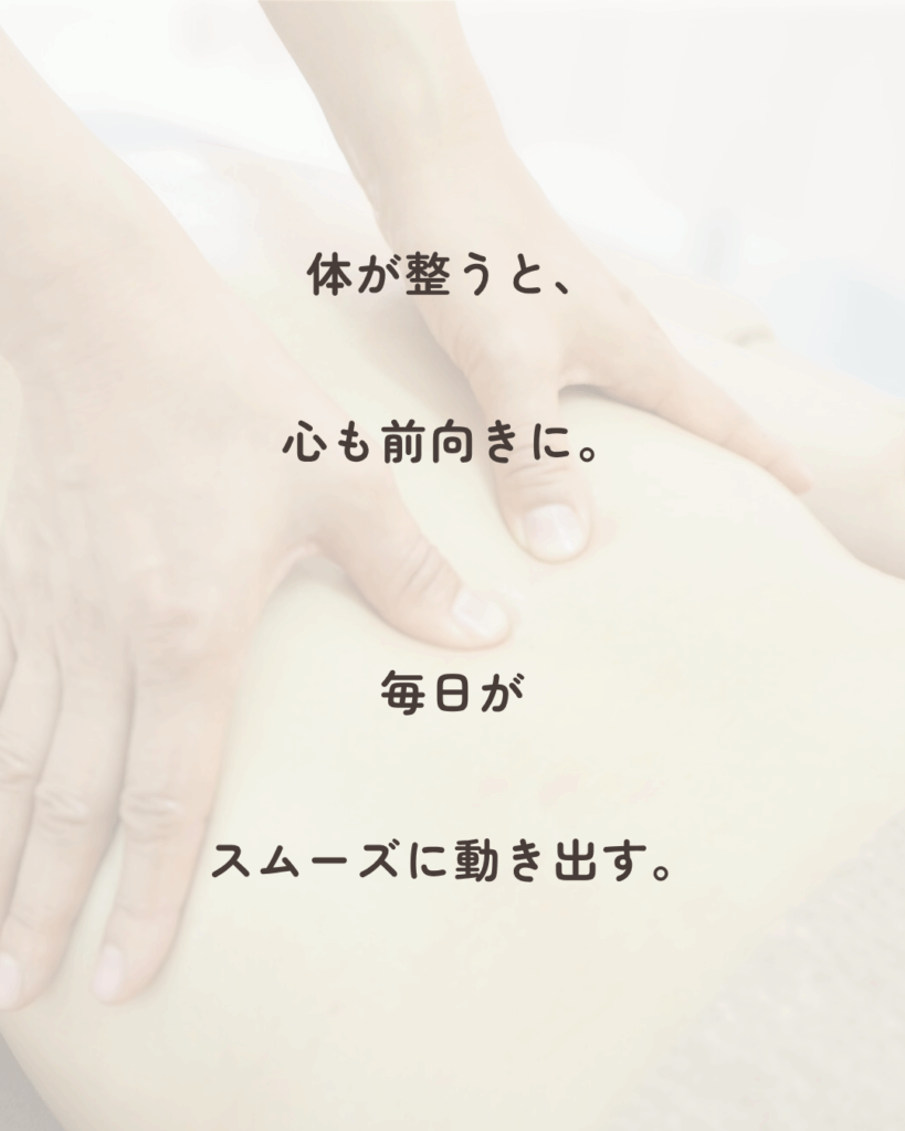 お体の状態を見極め、必要な部分にしっかりアプローチしていくことで、癒しと同時に体の機能を整え、未来の健康へつなげていきます。
