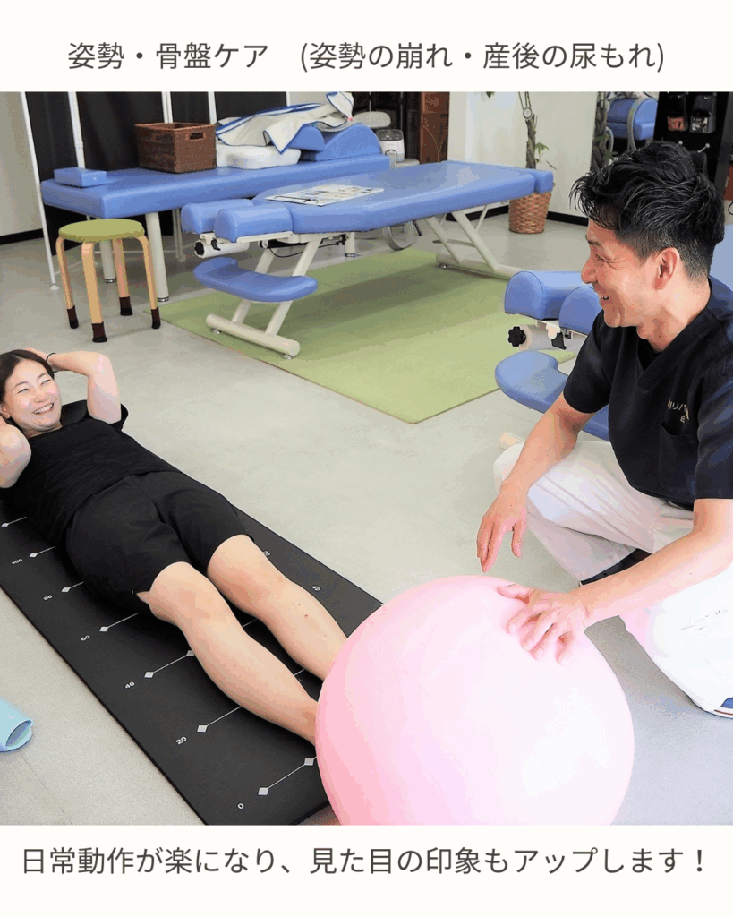 - 産後の肩こり・腰痛・尿もれ、姿勢の崩れが気になる方におすすめです。