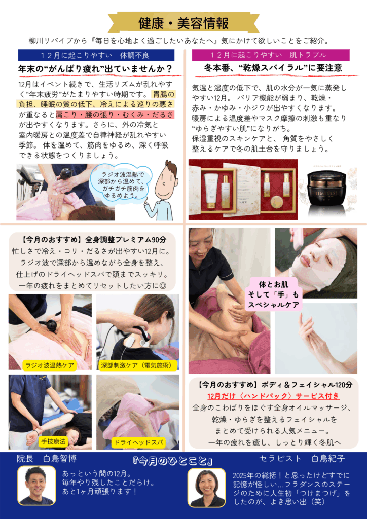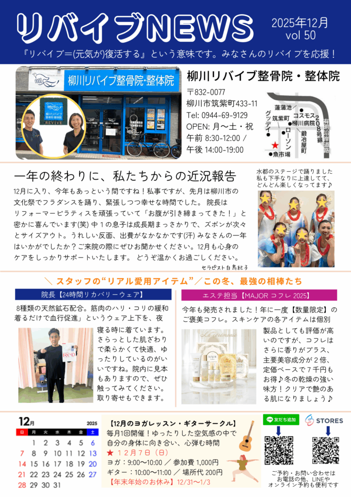 私たち柳川リバイブは、今年ラストの1ヶ月も、皆さまの体調管理をしっかりサポートいたします。